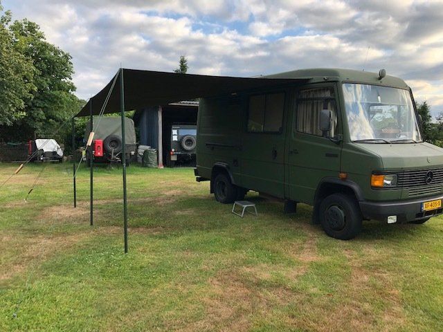 De Mercedes is een voormalige legerambulance; bouwjaar 1988